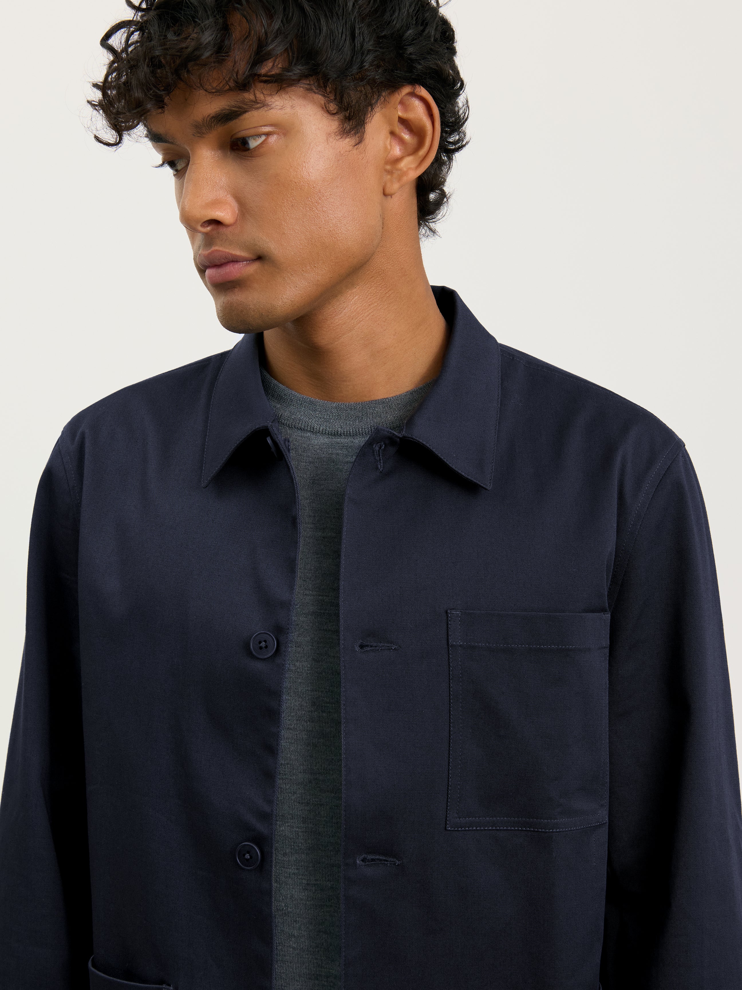 A quintessential chore jacket with a streamlined, modern design crafted from a durable, stretch 100% regenerative, heavyweight cotton twill. Designed in a regular fit with three utilitarian front pockets. Natural corozo nut button closure completes this staple. Wear with the Classic Tee and Heavyweight 24 Trouser to complete the look.
